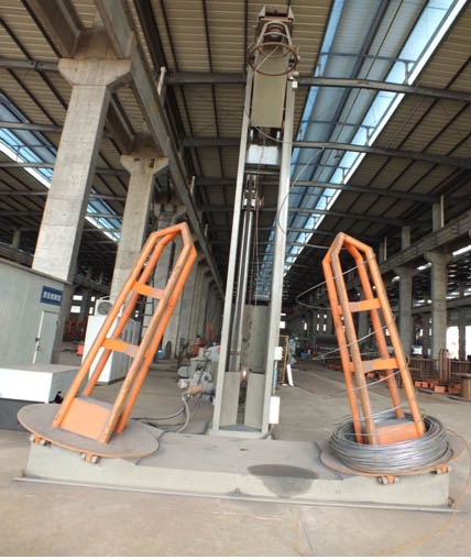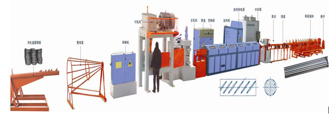 1、工藝簡介 本機組是用于生產冷軋二面帶肋鋼筋的專用設備,該套生產線可將Φ12-Φ14mm的Q235、300熱軋盤圓鋼筋(圖1),冷軋制成兩面有月牙的帶肋鋼筋(圖2) 圖1盤圓 圖2二面帶肋鋼筋 全套設備由放線架、整線籠、除鱗機、付軋機、主軋機、矯直、加熱、測溫、剪切、滑道、兩面接料、氣動自動推平、收線機等組成。機組按連續工作制設計,整套設備由PLC+觸摸屏系統控制。 下面是各組成部分結構及性能的簡單描述: (1)放線架 放線架的作用是保證該機組的高速運行,立式放線架(缺點是放線灰塵比炮筒式要大),一個是工作架,另一個是備儲架,當一個在放線時可對另外一個料架進行預裝料。當工作架上的盤圓放完時,將該卷盤圓的尾端與另備儲架上盤圓的頭端對焊打磨后,可繼續開機,可提高因停機后裝料而降低工作效率。