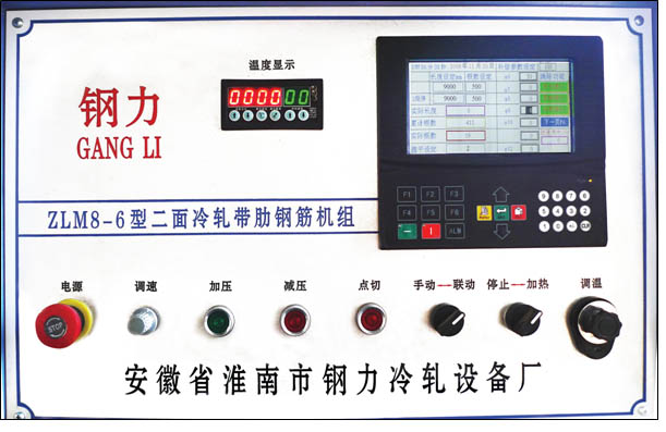 (4)一體式:主軋機 主軋機是螺紋鋼成型的最后一道工序,軋機受力大,要求軋機加工精度高、軋機有以下優點: 1、 中心免調整、(國內少有)大小新舊軋輥,軋機中心不用調 2、 軋輥更換方便、(國內少有)滑道抽屜式更換,10分鐘搞定。 3、 自動化程度高、(國內少有)全自動同心,換鋼筋進出導位不用調整,世界領先技術。 4、一體化高精度導位、(國內少有)上下左右,一個導位就能搞定。 5、獨有的電腦數控自動黃油加給系統,解決因工人不及時打油造成軸承損壞。 (5)控制臺 控制臺把軋機、加熱、切斷、落料、冷床、鋼筋落下擺動、推平、集中在一個面板上,真正做到一體化集中控制,把控制頭放在2臺軋機中間,做到不占車間位置,可在有限的廠房內安裝更多的設備,控制系統采用PLC程序控制,觸摸屏顯示,可以提高設備的運行穩定性和直觀性,可通過觸摸屏顯示故障位置。